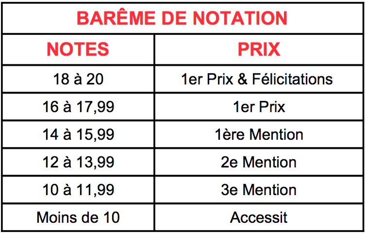 Pour toutes informations complémentaires sur le règlement de chacun des concours, leurs catégories, compositions de formations, classement, œuvres, notations et résultats, nous vous renvoyons vers les modalités des concours.
